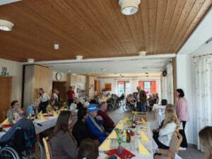 Im Anschluss begrüßte Einrichtungsleiterin Frau Eyring alle Anwesenden im Speisesaal. Auch Bürgermeister Holzleitner richtete herzliche Grußworte an die Bewohner und Ehrengäste. Musikalisch wurde die Feier durch gemeinsames Singen von zwei Liedern begleitet, bevor Pfarrer Tony das Tischgebet sprach.